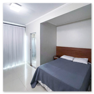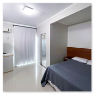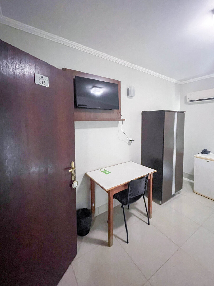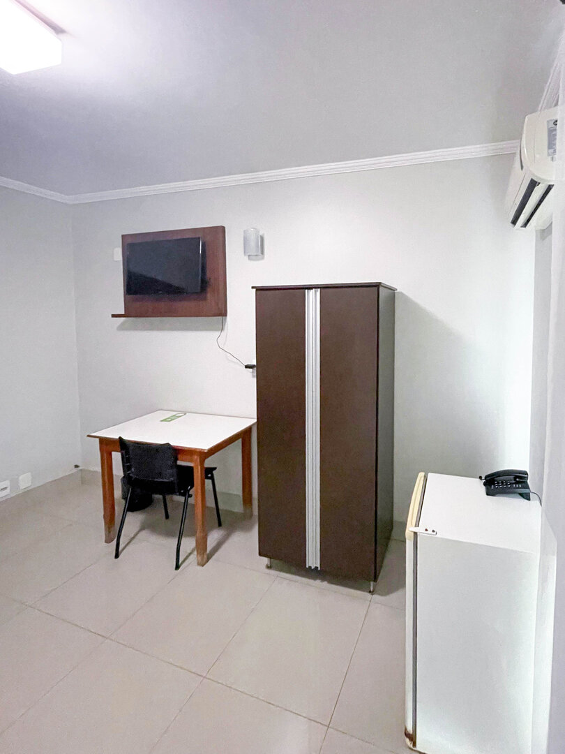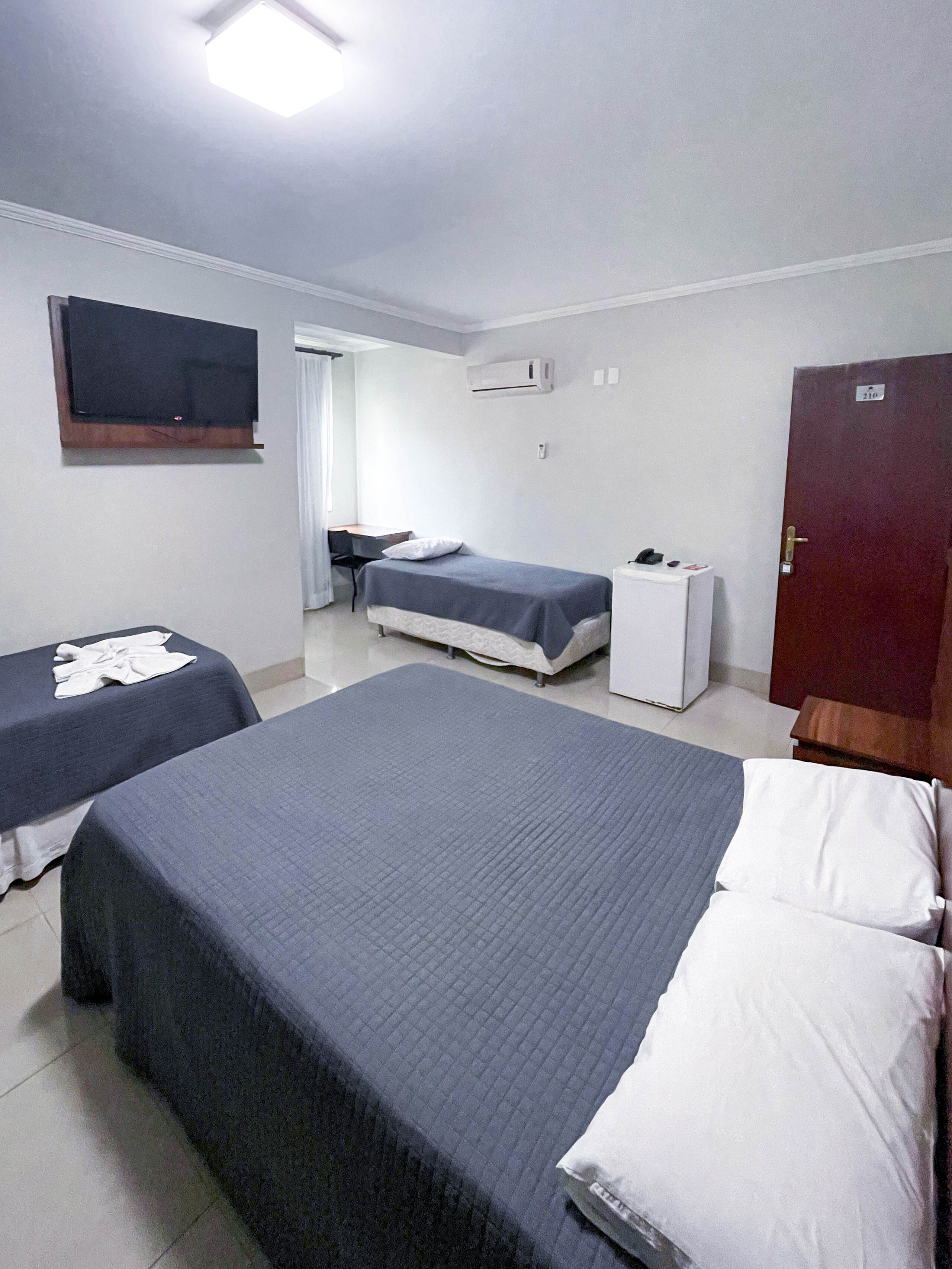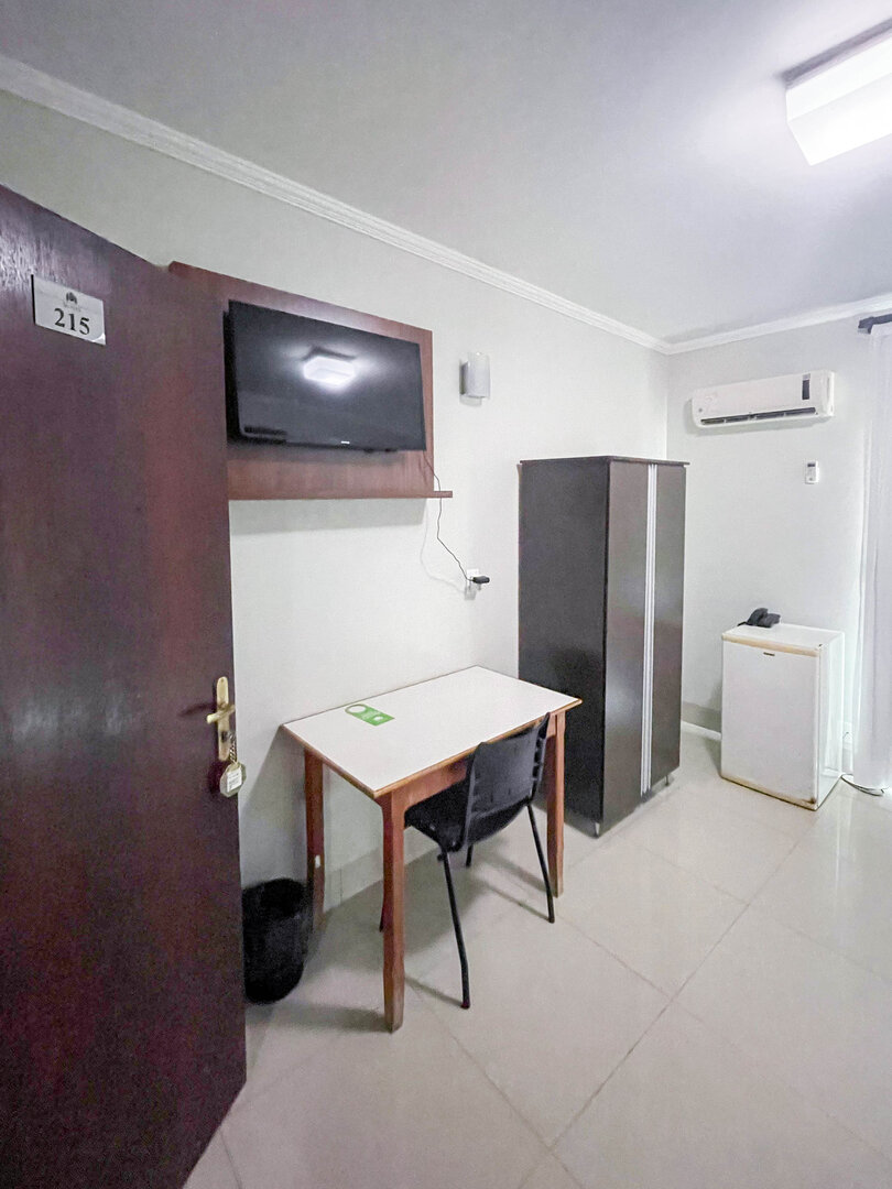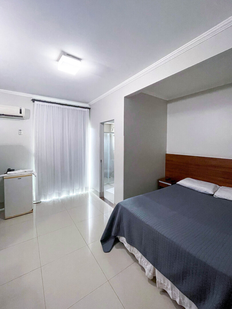 Cama de casal, amenidades de banho (sabonete, toalhas, etc.), Wi-Fi, frigobar, TV, ar-condicionado, telefone